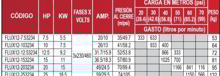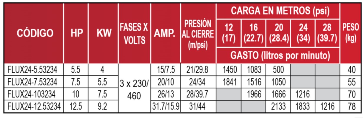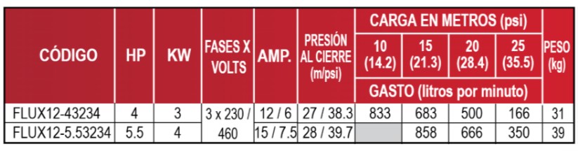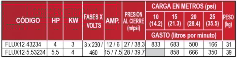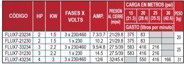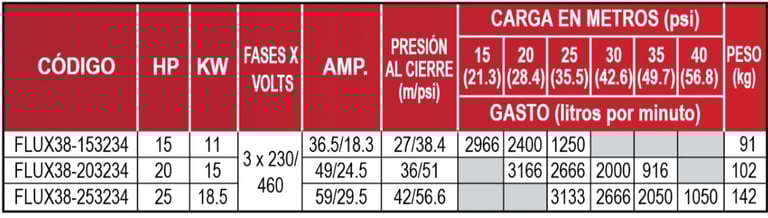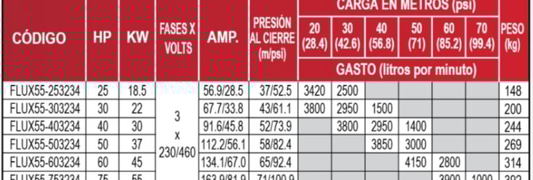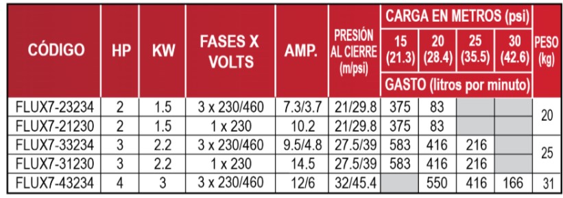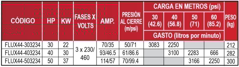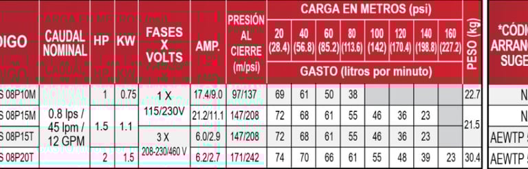 Motor Asíncrono. 2 polos. Aislamiento clase F. Servicio continuo. Enfriamiento TEFC. Máxima temperatura del fluido 50°C. Autoaspirante a 3 m