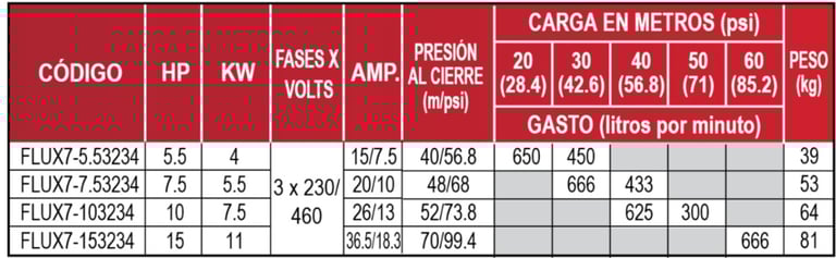 Motor: Asíncrono, dos polos. Aislamiento clase F. Totalmente cerrado enfriado por ventilador (TCCV). Protección térmica incorporada en equipos monofásicos. Servicio continuo. Grado de protección IP55