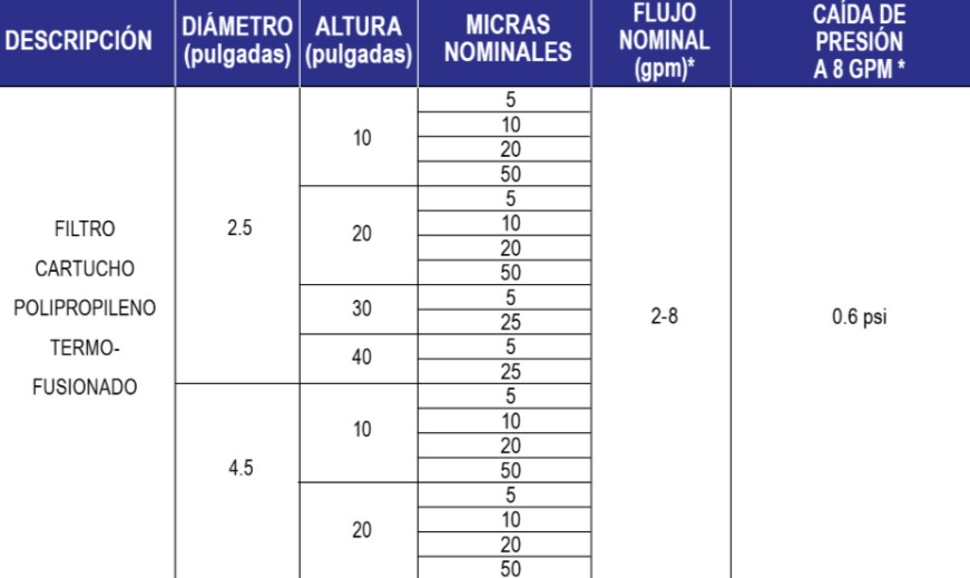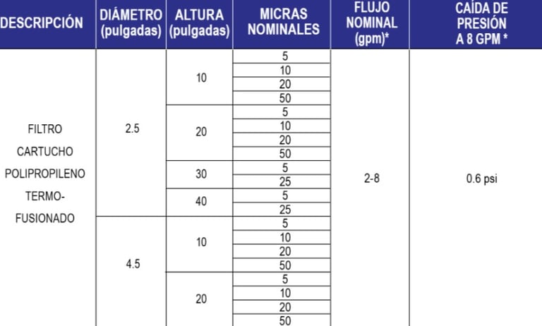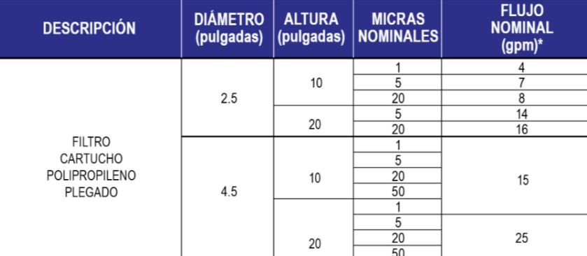 Niveles de filtración 1, 5, 10, 20, 25 y 50 micras